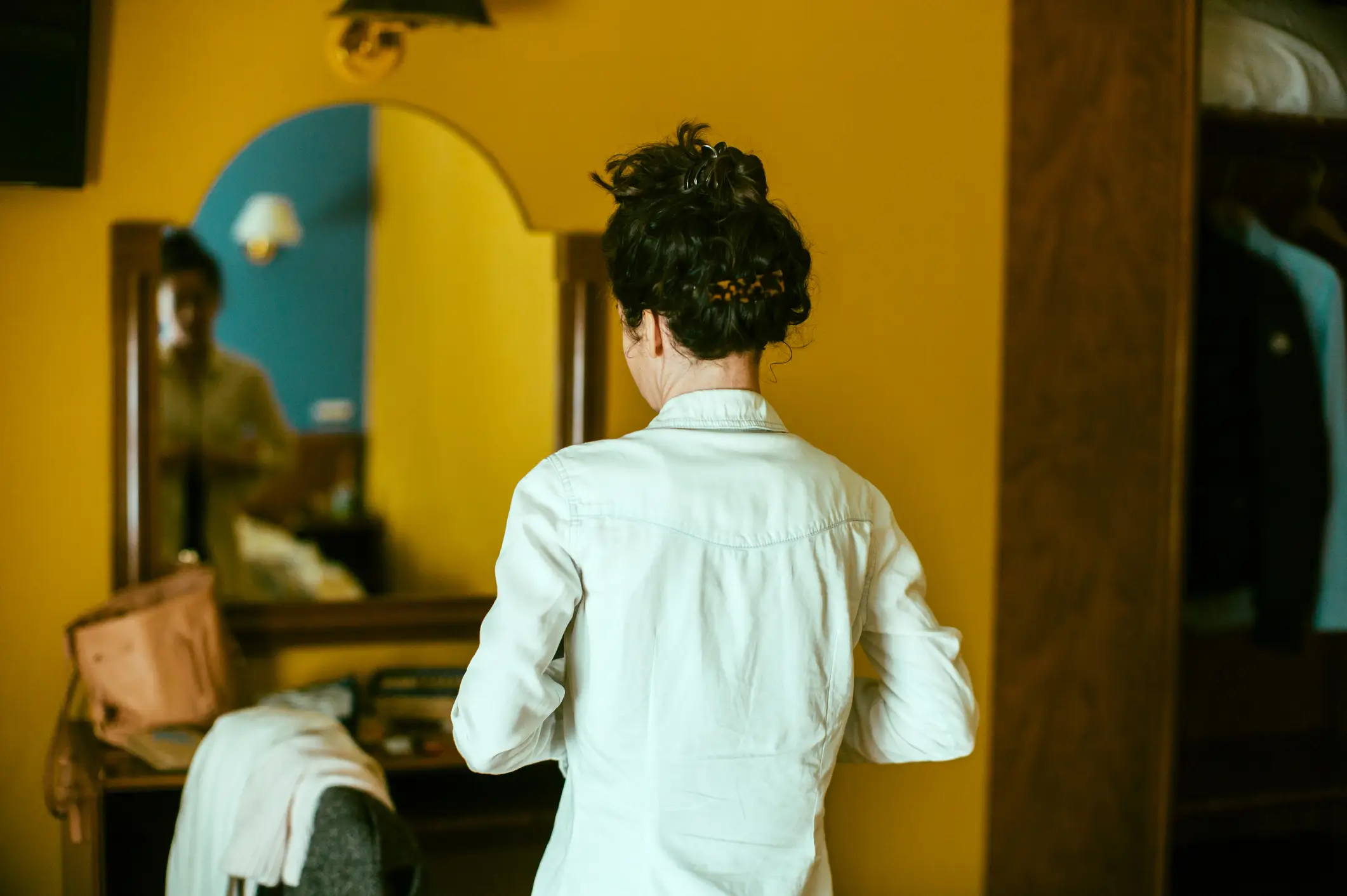 person looking out the window into the city